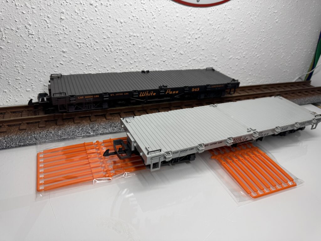 44600-Set | Rungenwagen 546 grau und 543 schwarz der "White Pass",mit orangenen Rungen | 2 | 2x4 | Ersatzverpackung | 129,00€ | LGB |