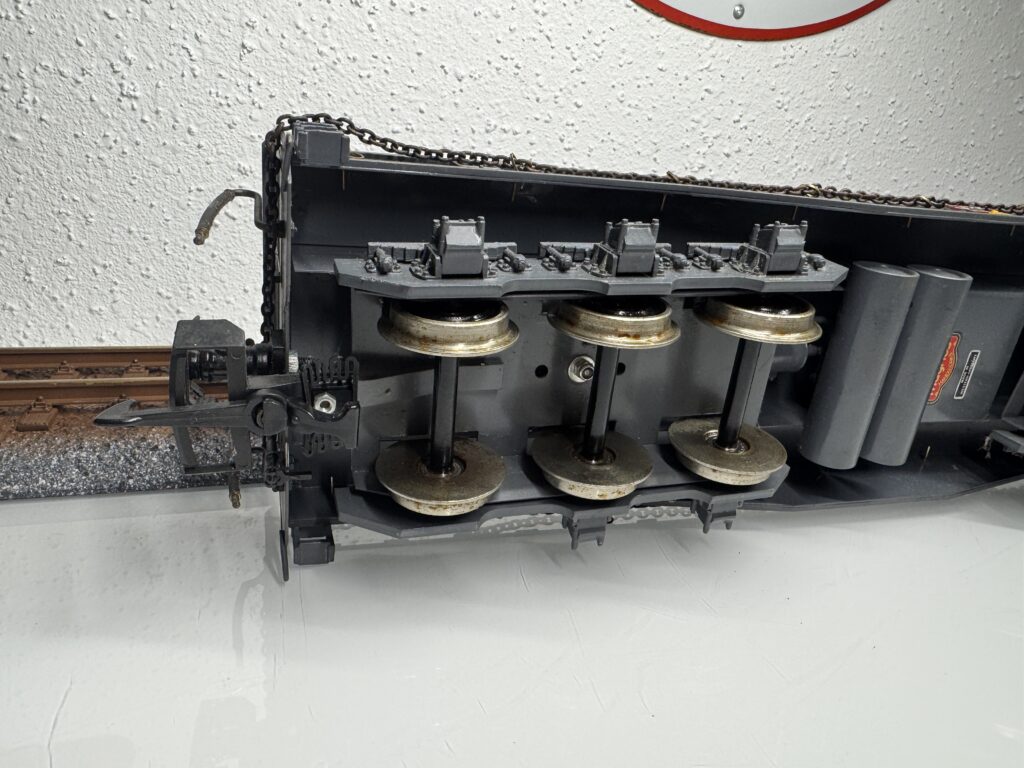 Niederbordwagen mit Auto(Metallmodell) und LGB-Schienenräumer mit neuen Schleifpads