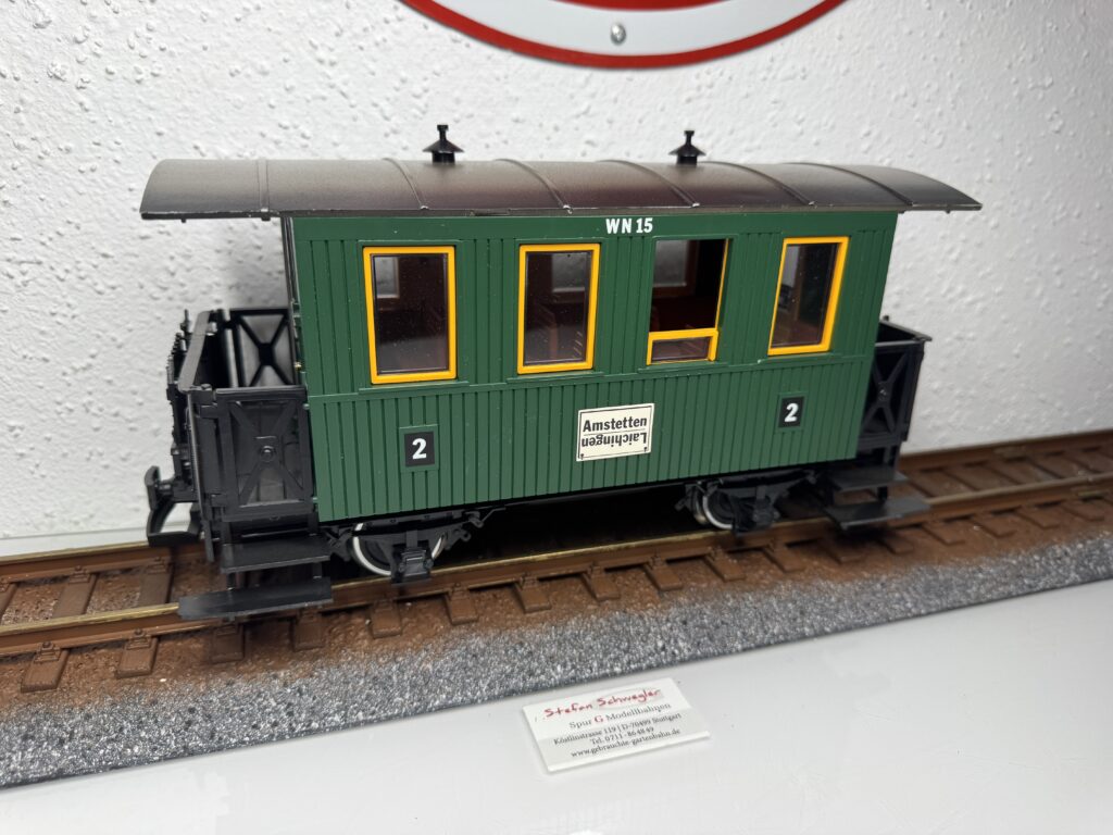 3106-2 | Personenwagen der WN Amstetten-Laichingen Nachgerüstet mit Innenbeleuchtung über Kugellagerachsen Achtung:Wie abgebildet sind die Trittbretter abgebrochen!! | 3-4 | 2,Kugellager | Ja | 59,00€ | LGB | |