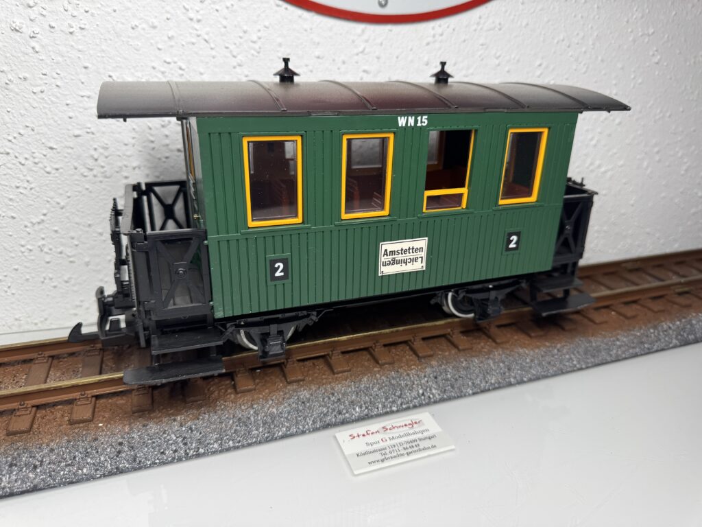 3106-1 | Personenwagen der WN Amstetten-Laichingen Nachgerüstet mit Innenbeleuchtung über Kugellagerachsen | 2-3 | 2,Kugellager | Ja | 69,00€ | LGB | |