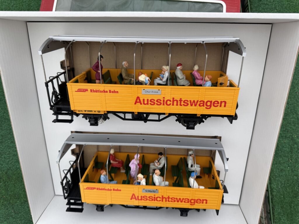 39250 | 2 RhB Aussichtswagen,gelb mit vielen Figuren und Metallachsen | 2 | 2x2,Metall | Ja | 259,00€ | LGB |