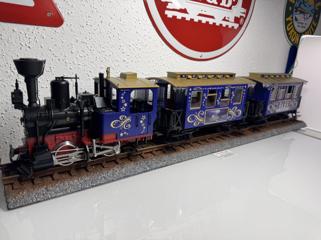 70305 | Startset Weihnachtszug mit blauer Dampflok und 2xPersonenwagen Schienenkreis+Netzteilmit Regler | 1 | Nein | Nein | Ja | 399,00€ Ohne Schienen und Trafo= 369€ | LGB |